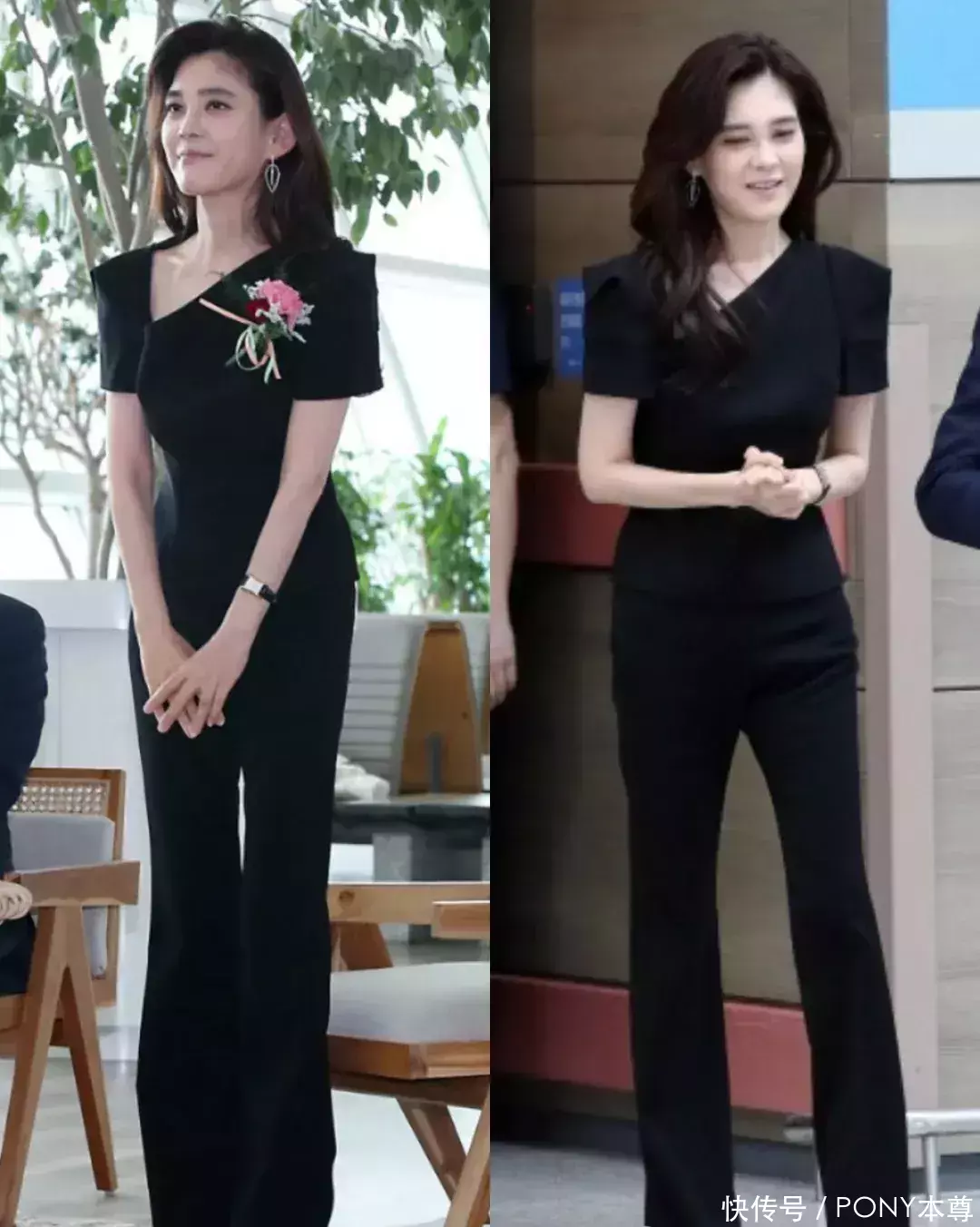 中年职场女性,除了要保持穿搭的得体,有时候还需要增强个人的气场,李富真在穿裤装时,几乎都是长款盖过脚面的直筒裤或者微喇裤,这种裤子不仅能修饰腿型,还能遮挡住高跟鞋的高度,无形中增高!显得身材比例更好,腿更长,气场更强大。
