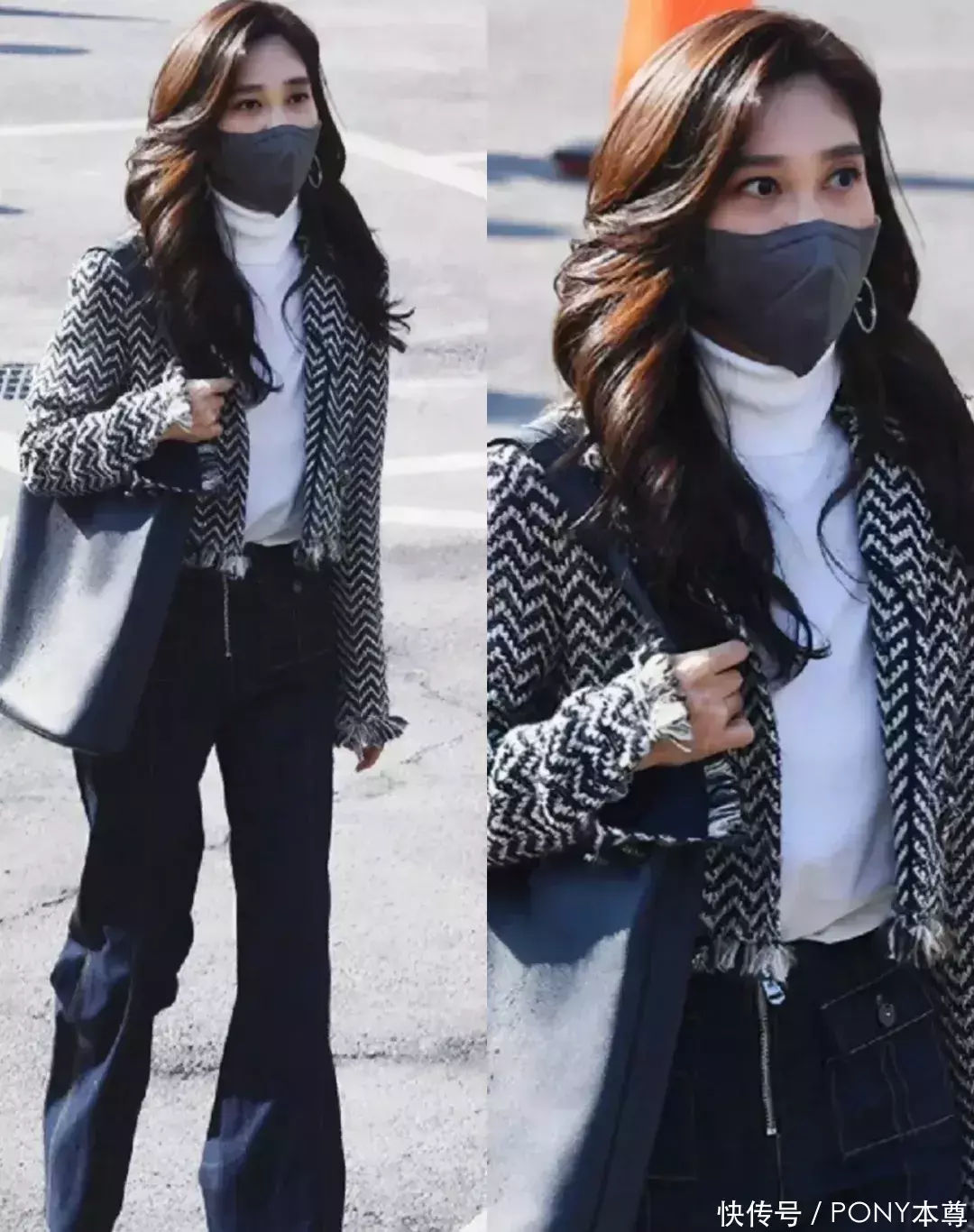 值得注意的是,短外套,内搭可以选择和裤子同色系的短上衣,但是如果搭配的是深色系的长裤,直接选择白色打底,基本不会出错。像李富真穿的小香风外套,内搭一件白色高领衫,就很日常。